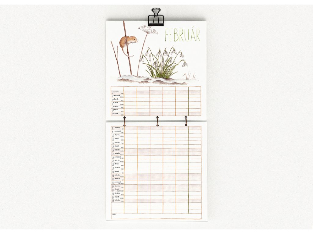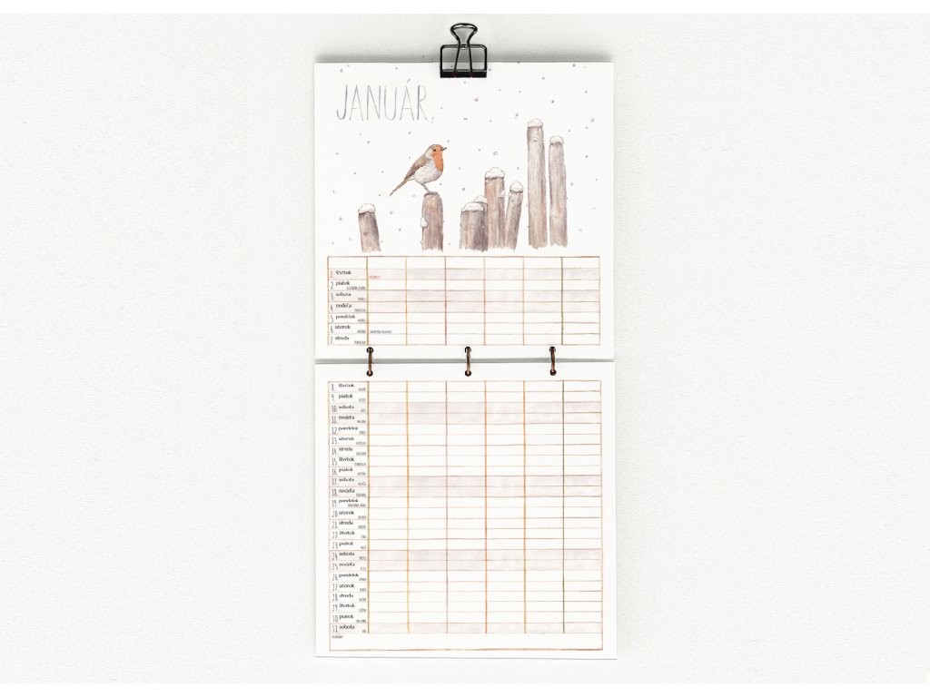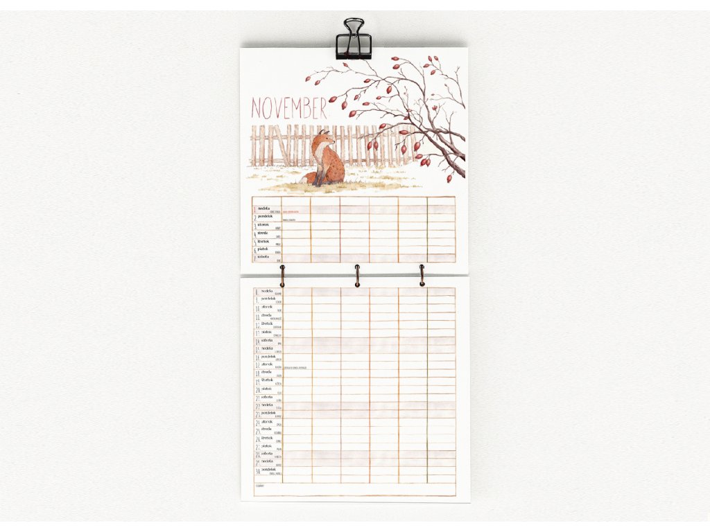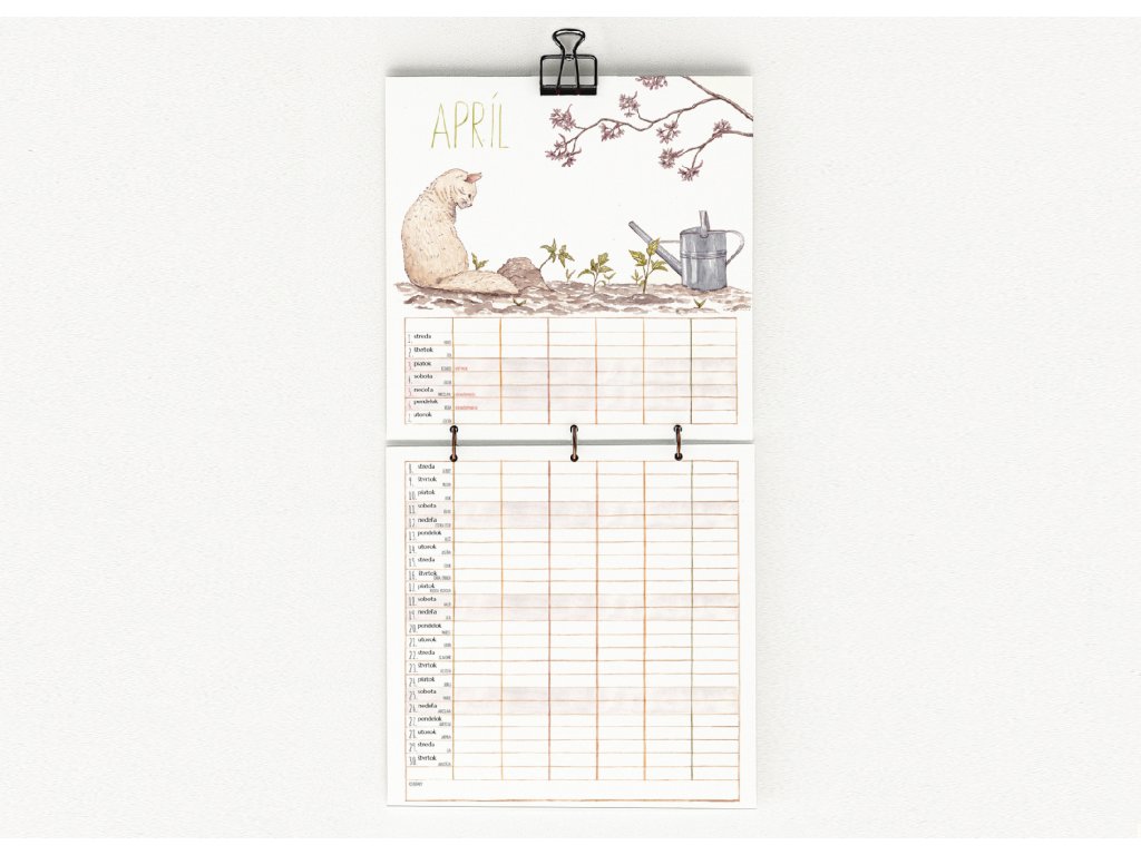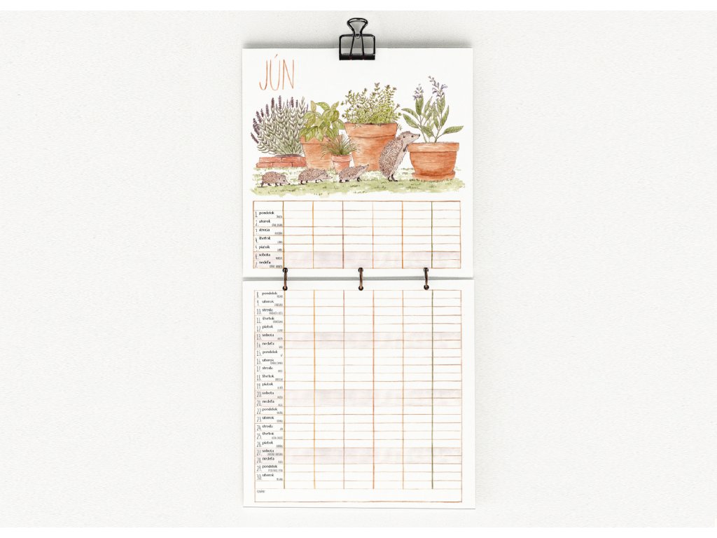 Rodinný plánovací kalendár s tematickými ilustráciami ku každému mesiacu. Obsahuje slovenské mená aj sviatky, a dostatok miesta v každom políčku na poznámky.