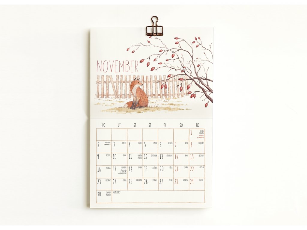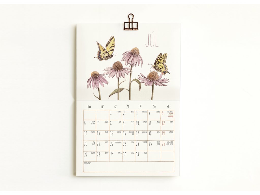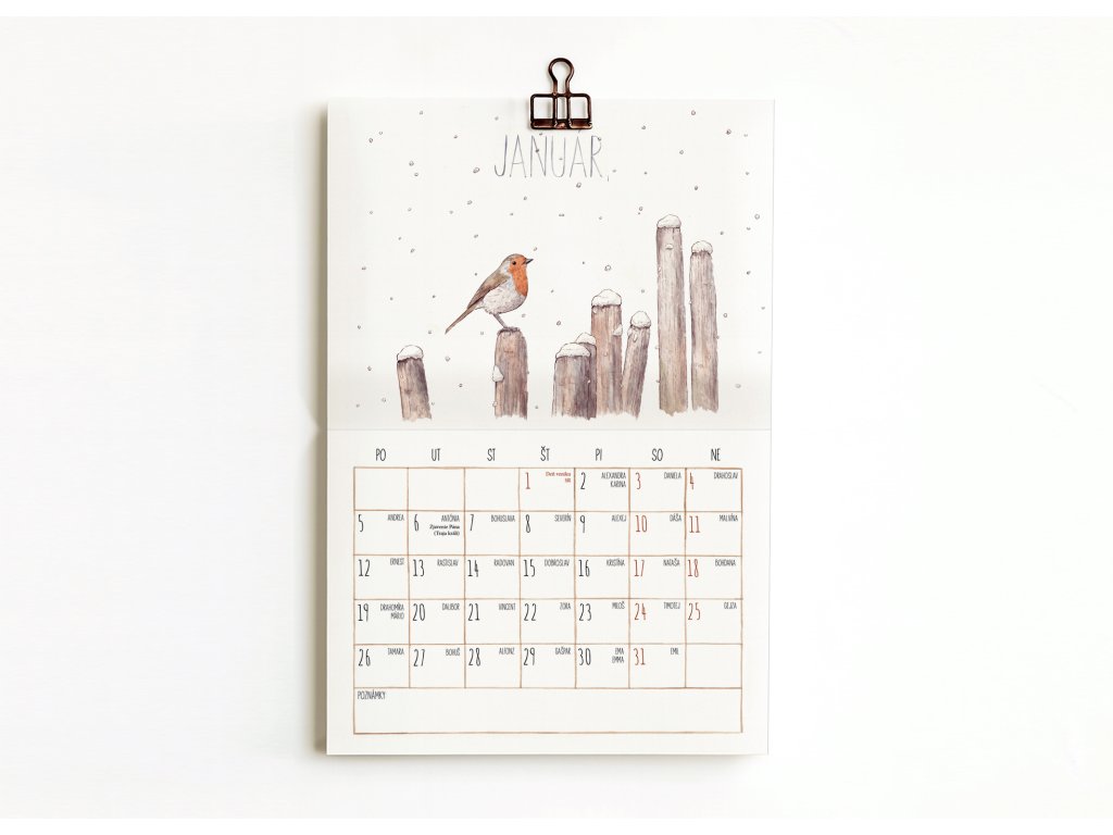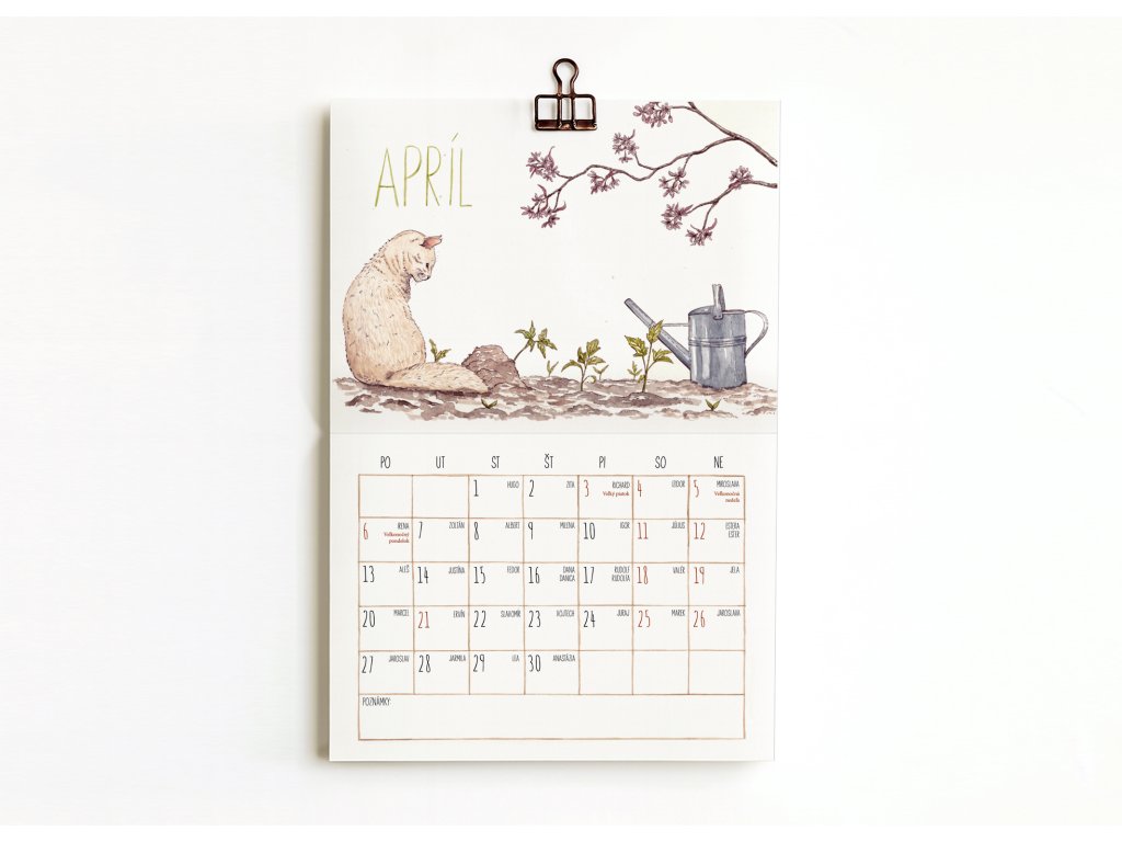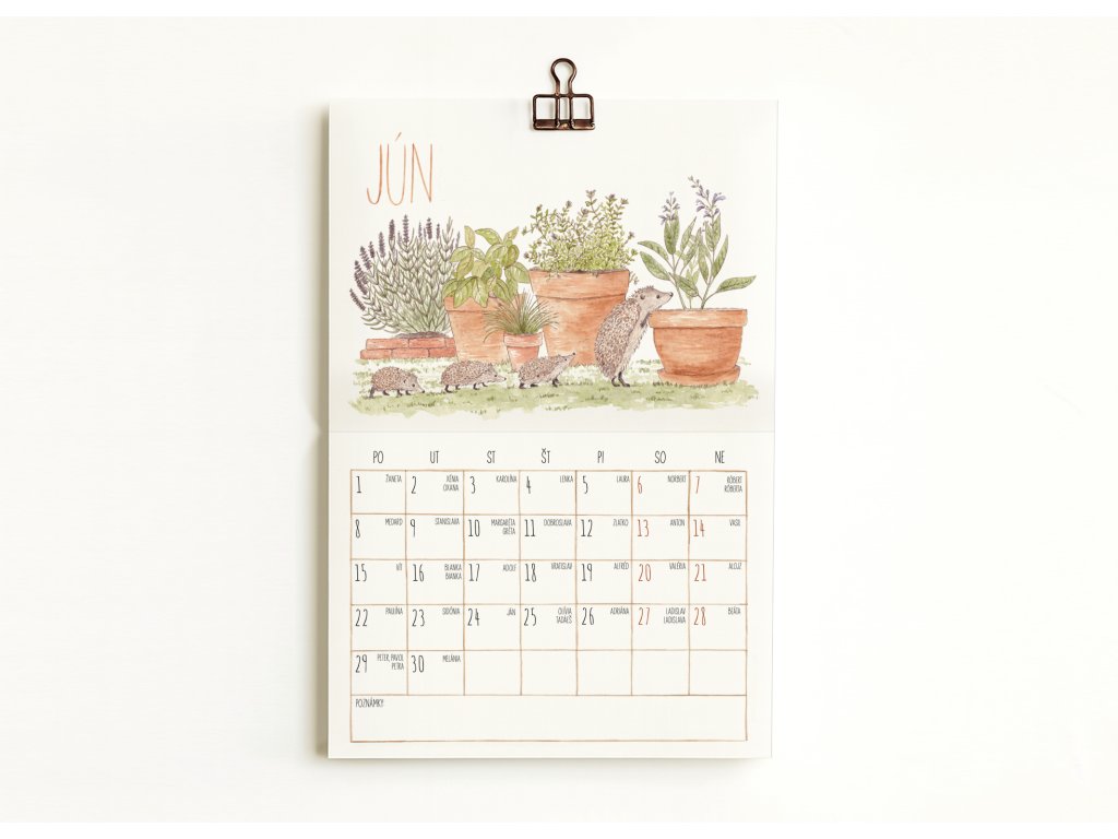 Kalendár s tematickými ilustráciami ku každému mesiacu. Obsahuje slovenské mená aj sviatky, a dostatok miesta v každom políčku na poznámky.